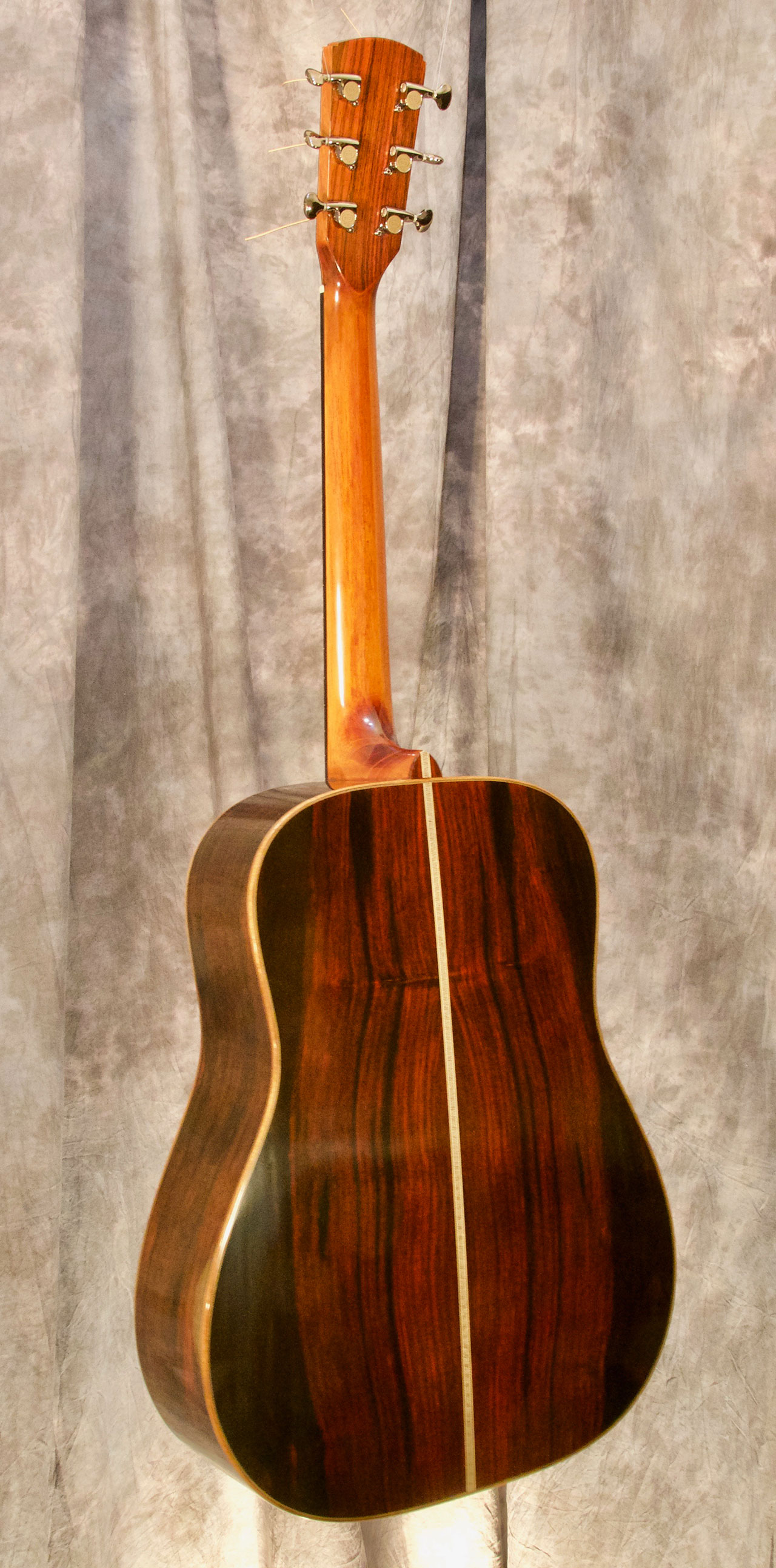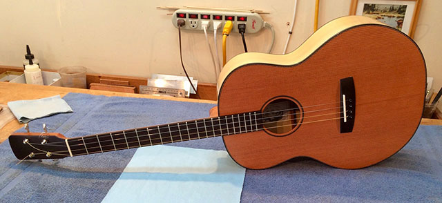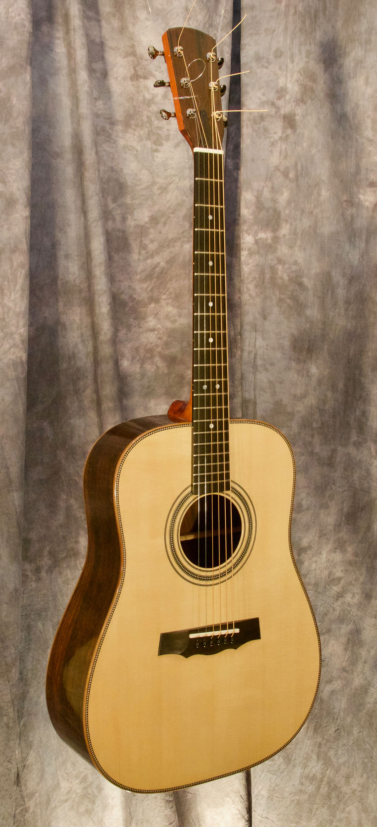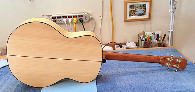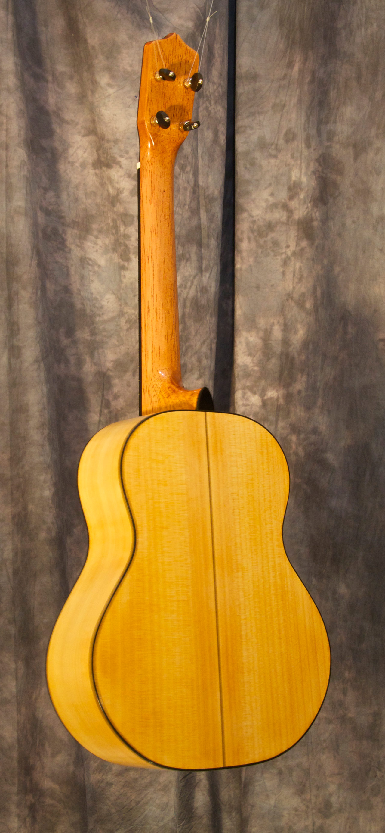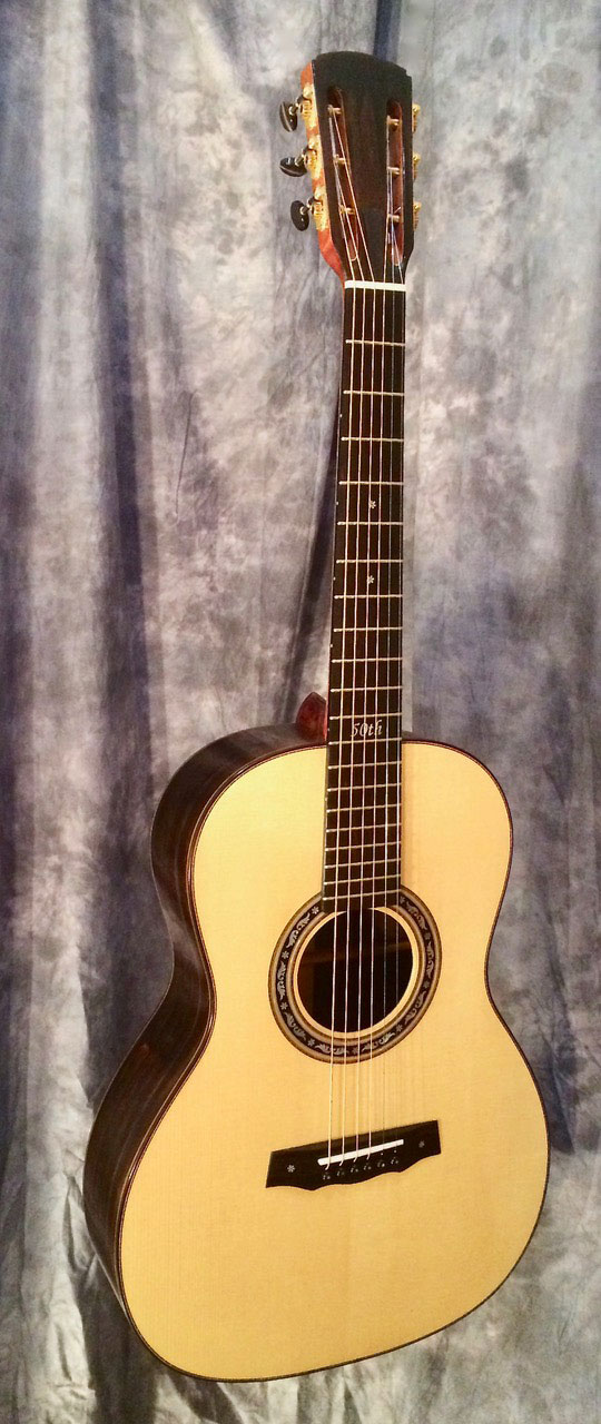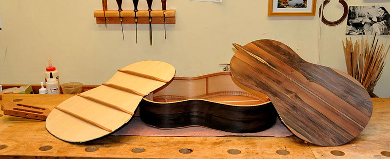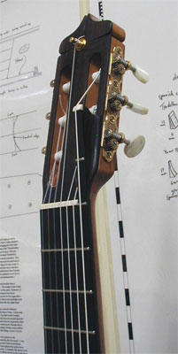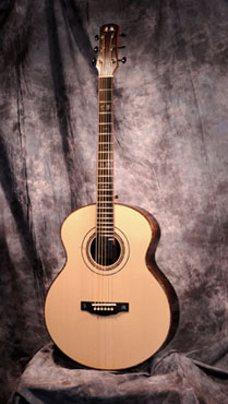 The 'Premier Edition' is the latest advancement to my guitar design. These guitars are sounding even bigger and stronger than before. In these guitars I have lined not only the sides but the back as well. The grain direction is the same for both layers so it is not a plywood. You may think the wood on the outside doesn't matter any longer but that would be untrue. The outer wood still sounds like normal but with some color changes to the over all tone depending on what wood is used to line the inside of the back. I have tried three different woods to line the back, Redwood, Cypress, and Brazilian Rosewood. All three sounded superb but each had it's own color pallet.