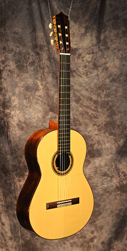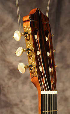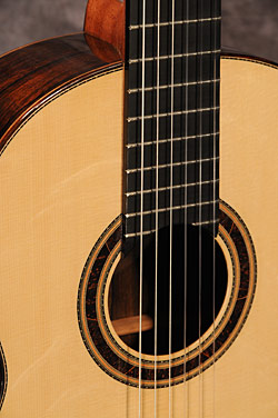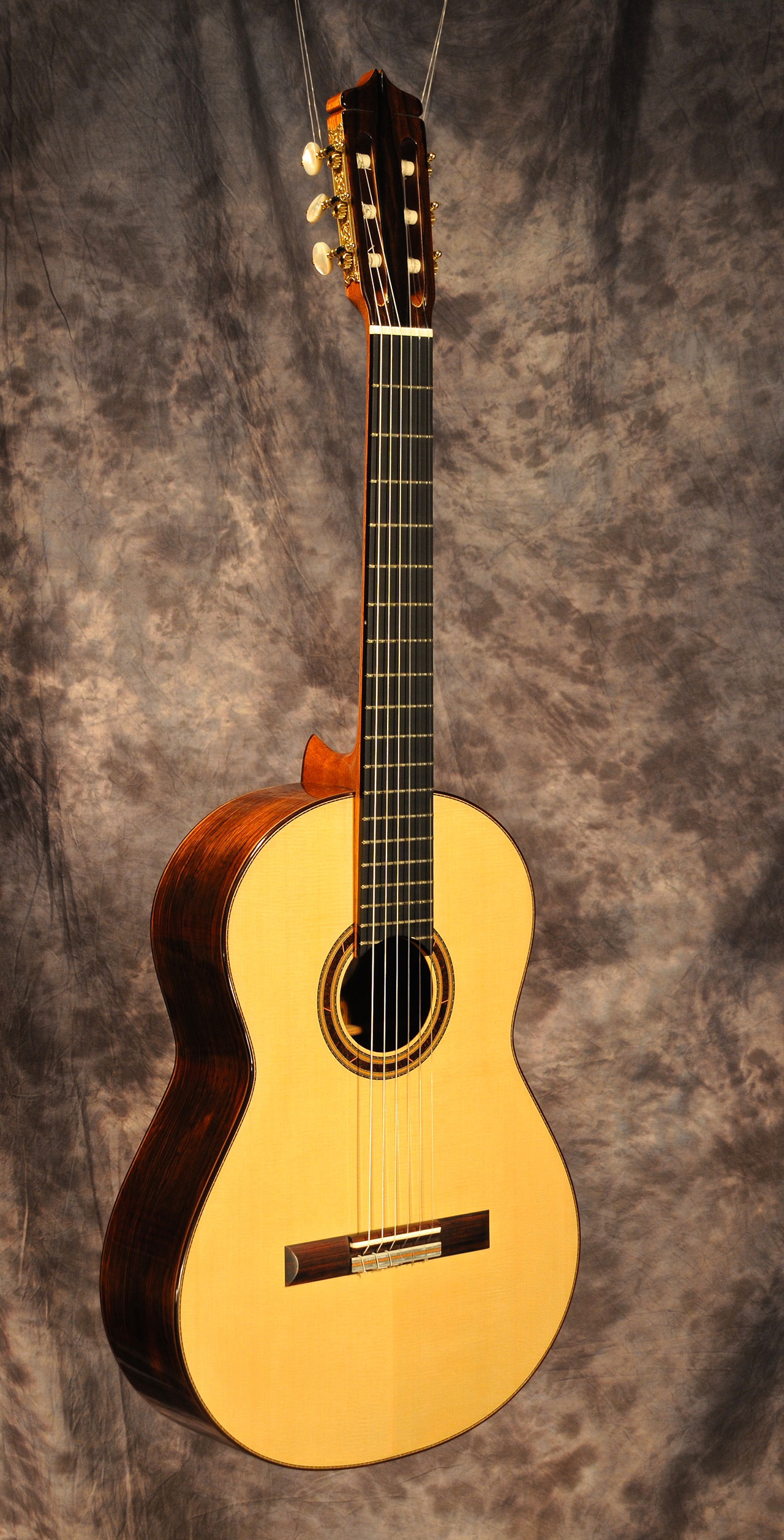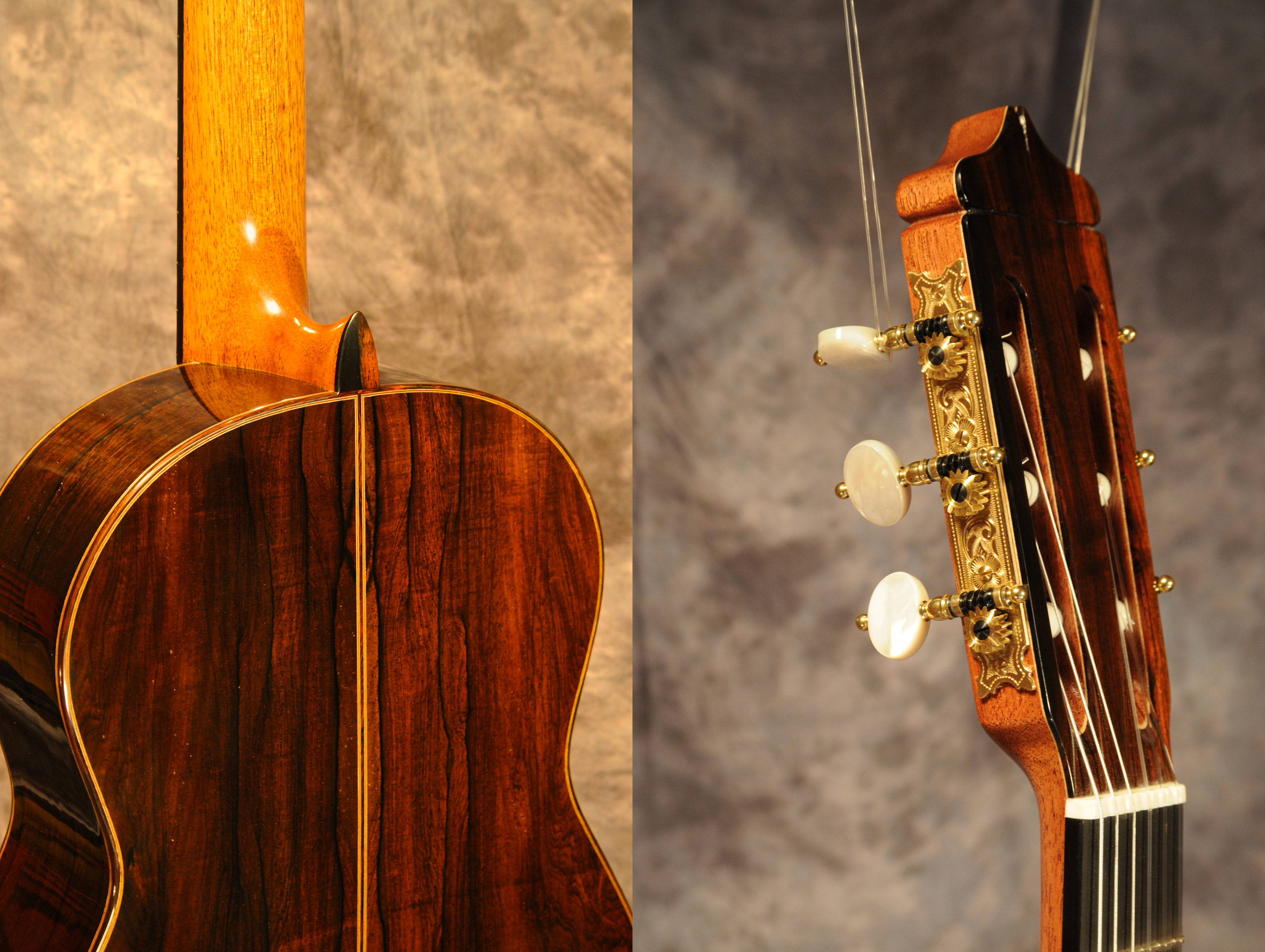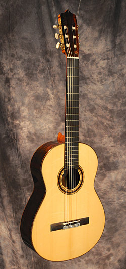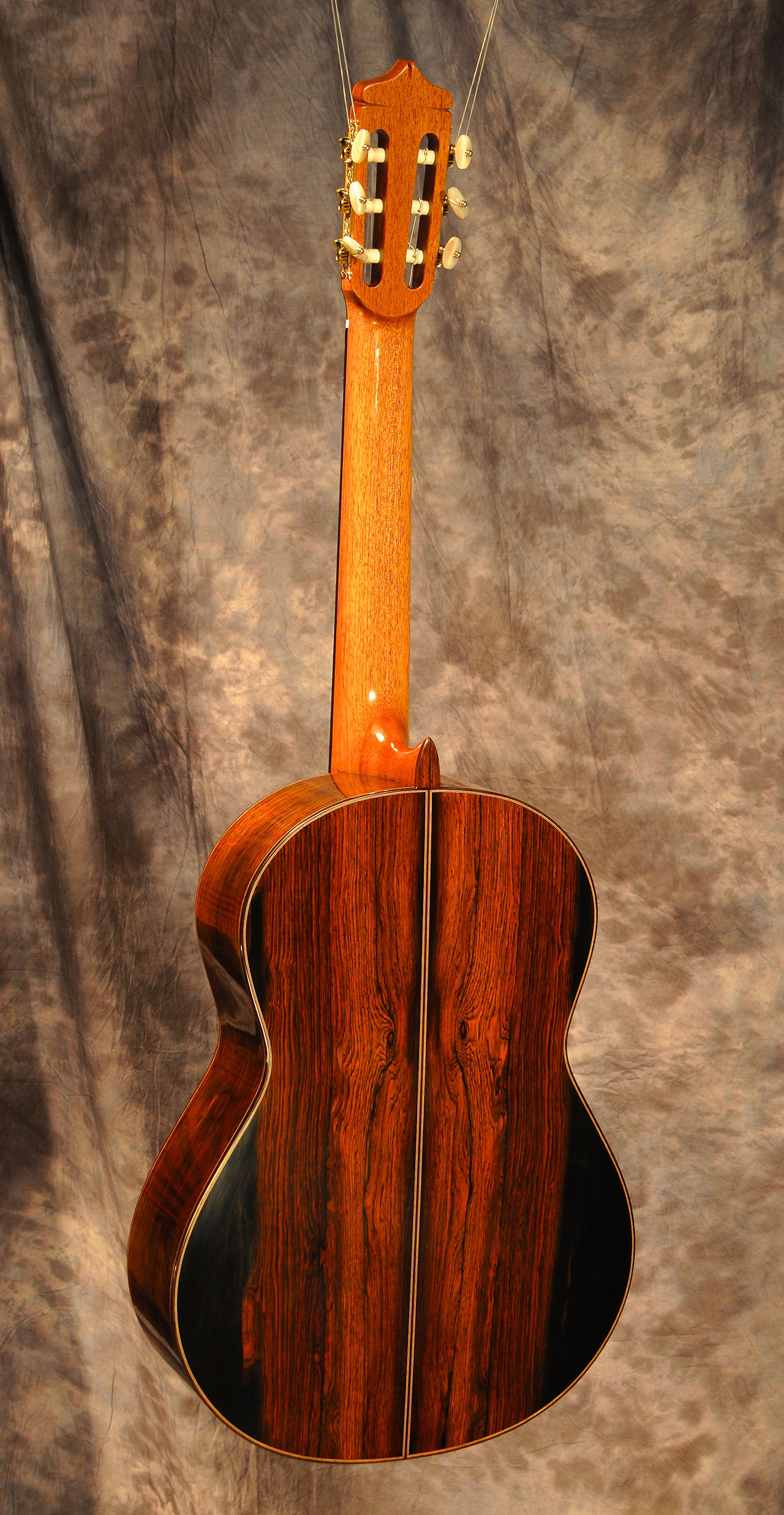 Series 45 number threeSeries 45 number three of four. Ancient Brazilian rosewood from the 1850s, Spruce double top, 650mm scale, 52.5mm wide nut. Rodgers tuners Esteso style, French polish finish. Click on image for full-sized photo