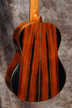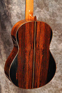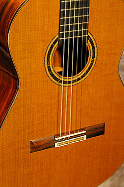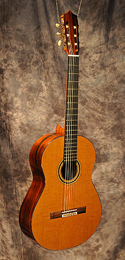 Series 45 number two of four. Ancient Brazilian Rosewood from the 1850s, traditional cedar top with ribbon flame, 650mm scale, 52mm wide nut, Graf tuners (Esteso model available), French polish finish. SOLD! Click on image for full-sized photo